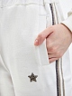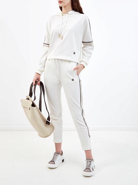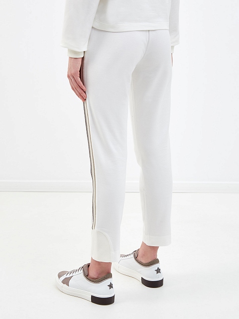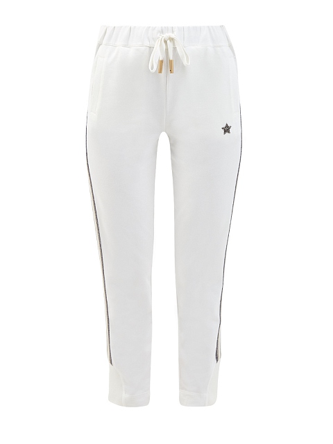 Укороченные брюки-джоггеры от Lorena Antoniazzi выполнены из легкого хлопкового джерси в молочном оттенке. Контраст фактур в образ вносят трикотажные лампасы с металлизированной нитью ламе и логотип с кристаллами Swarovski. Универсальный дизайн с эластичным поясом на кулиске и прорезными карманами делает модель идеальной для путешествий и активного отдыха. Сделано в Италии.