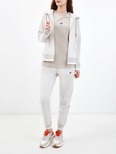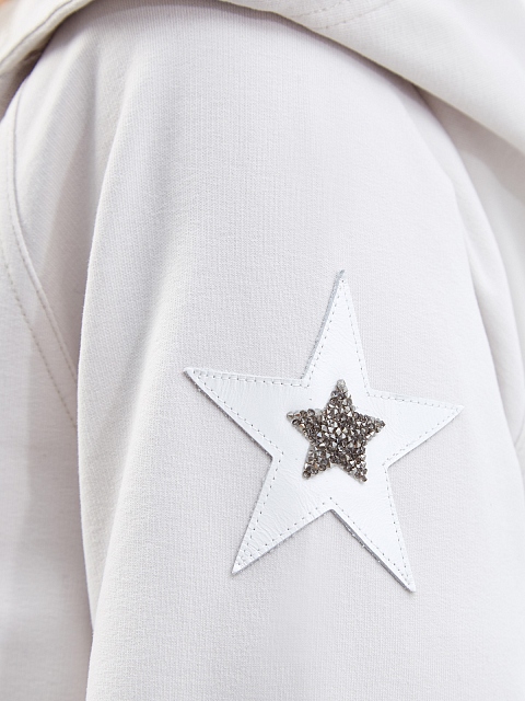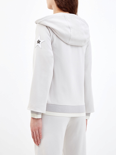 Толстовка от Lorena Antoniazzi выполнена из мягкого хлопкового джерси, выверенный состав обеспечивает максимальный комфорт в движении. Контраст фактур в образ вносит нашивка из кожи с мерцающими кристаллами Swarovski. Универсальный дизайн с капюшоном, молнией и накладными карманами делает модель идеальной для путешествий и активного отдыха. Сделано в Италии.