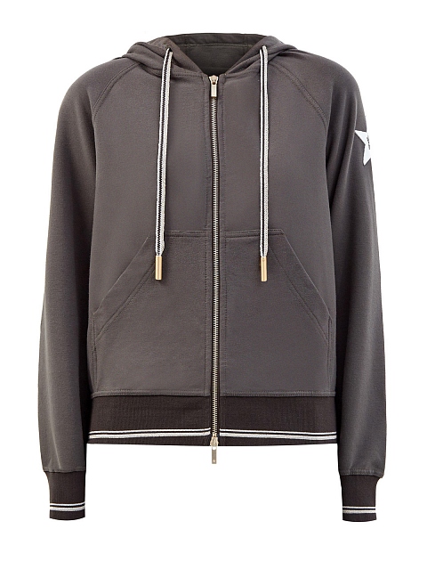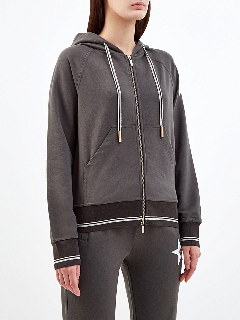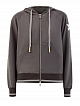Женская толстовка из мягкого хлопка от Lorena Antoniazzi. Модель с эластичной отделкой кромок в английскую резинку идеально подходит для путешествий и активного отдыха. Контраст фактур в образ вносят нашивка из кожи с мерцающими кристаллами Swarovski и окантовка из нити ламе. Детали: капюшон на кулиске, накладные карманы. Сделано в Италии.