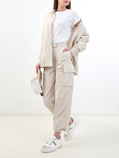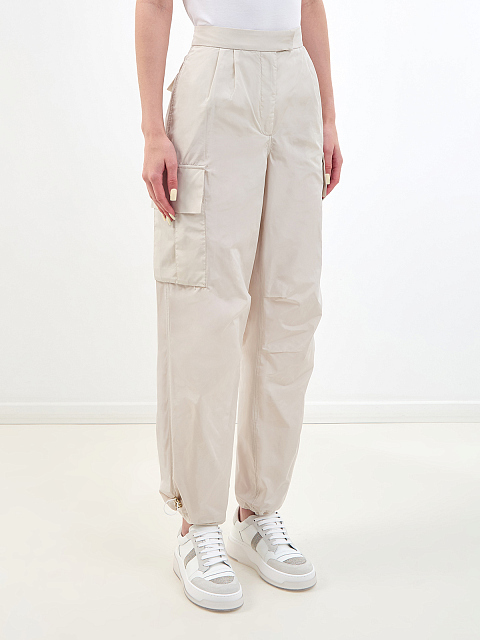 Стильные брюки-карго от Lorena Antoniazzi выполнены из технологичного матового нейлона с невесомой текстурой. Регулируемые манжеты на кулисках позволяют моделировать силуэт индивидуально, объемные карманы делают модель функциональной и комфортной. Детали: высокая посадка, защипы от линии талии, застежка на молнию, крючки и пуговицу, символика бренда на спинке. Сделано в Италии.