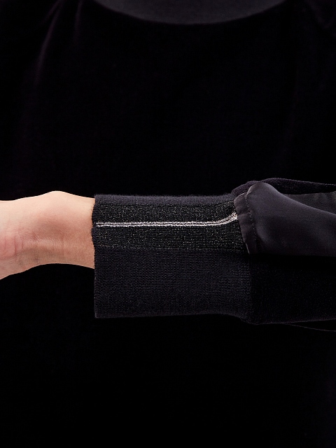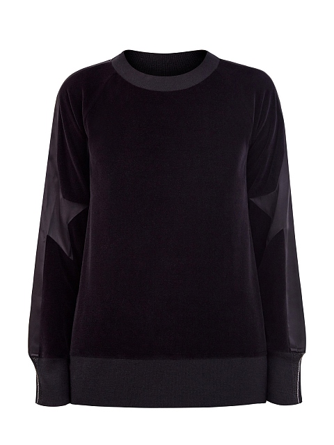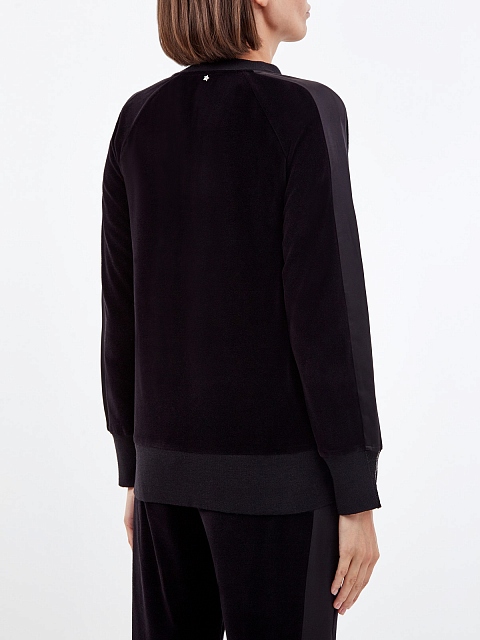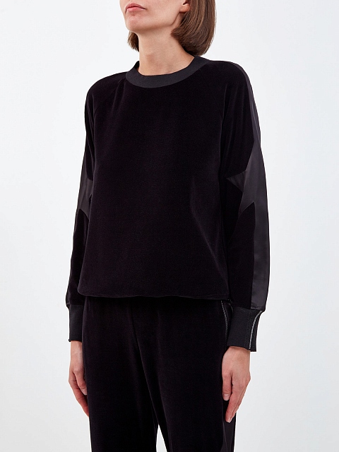 Свитшот из велюра от Lorena Antoniazzi представлен в универсальном черном цвете. Фактура материала с поглощающим свет эффектом подчеркнута глянцево-гладким атласом на лампасах. Нижний край и манжеты дополнены эластичной вязаной отделкой с нитью серебристого люрекса. Детали: круглый вырез, комфортный свободный крой, рукава-реглан. Сделано в Италии.