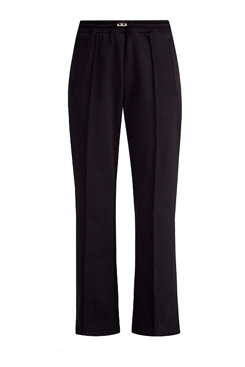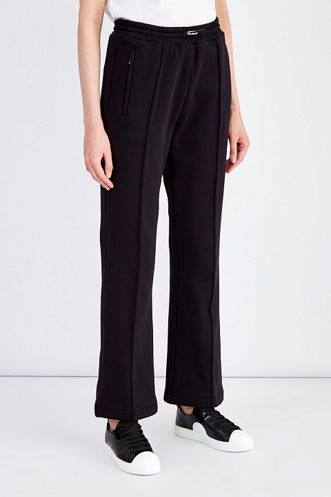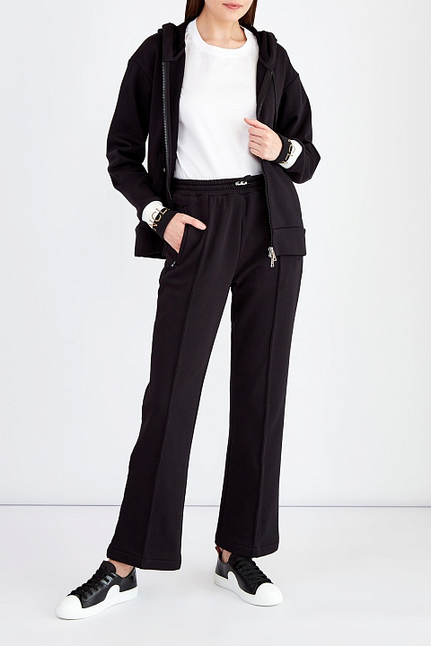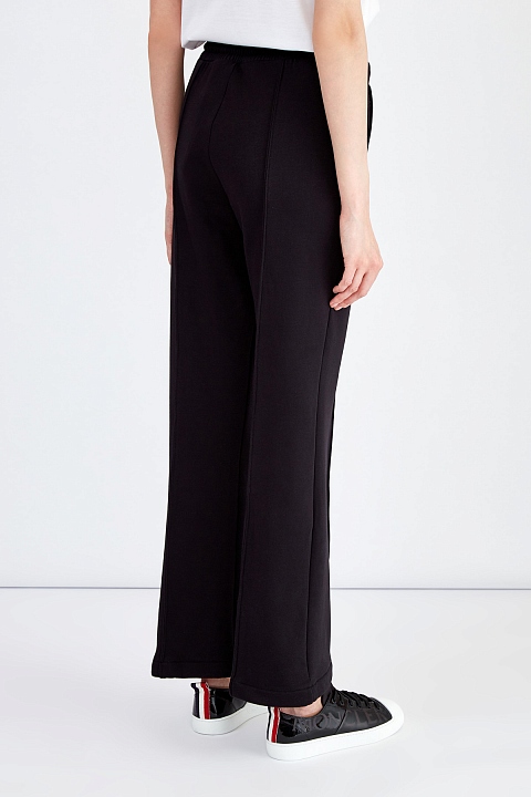Минималистичные брюки от Moncler выполнены из плотного хлопкового футера черного цвета. Фактурная внутренняя поверхность дополнительно утепляет изделие. Простроченные стрелки визуально вытягивают силуэт, а расклешенный от бедра крой формирует гармоничные пропорции. Детали: пояс на кулиске с металлическим фиксатором, прорезные карманы на молниях.