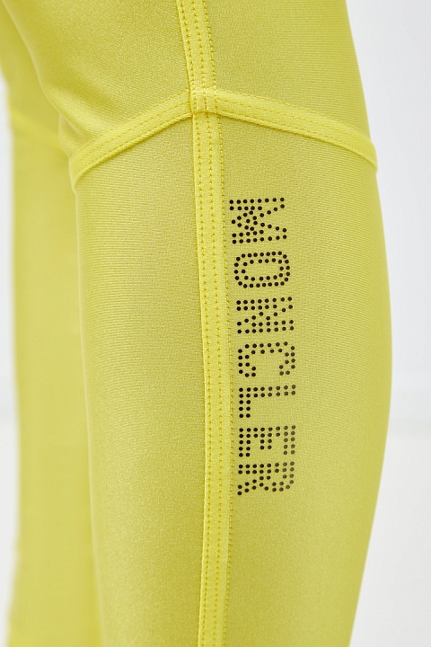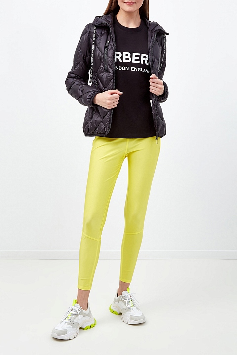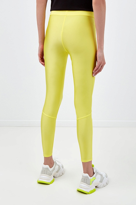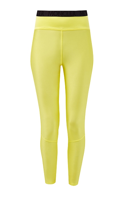 Яркие леггинсы от Moncler выполнены из технического джерси с легким сатиновым блеском. Colorblock-дизайн сочетает неоново-желтый и базовый черный тона. Плотная структура материала создает моделирующий эффект, а объемные швы визуально структурируют образ. Широкий пояс с фактурной монограммой бренда обеспечивает комфортную посадку.