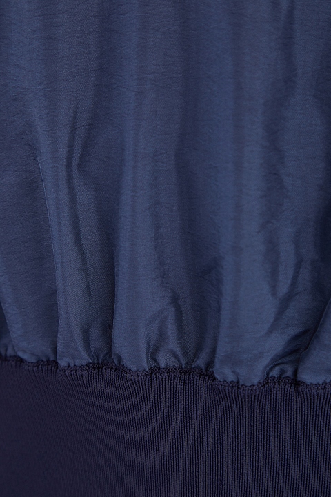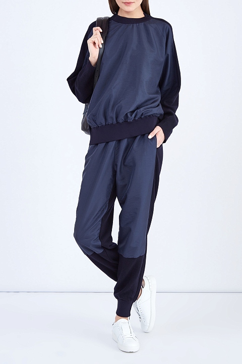 Женский свитшот из коллекции Stella McCartney свободного кроя, выполненный из шерстяного трикотажа синего цвета на спинке и контрастной по фактуре вставкой из нейлона спереди. Модель с длинными рукавами-реглан, круглым воротом, эластичными резинками на кромке и манжетах, что формирует комфортный расслабленный образ.