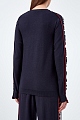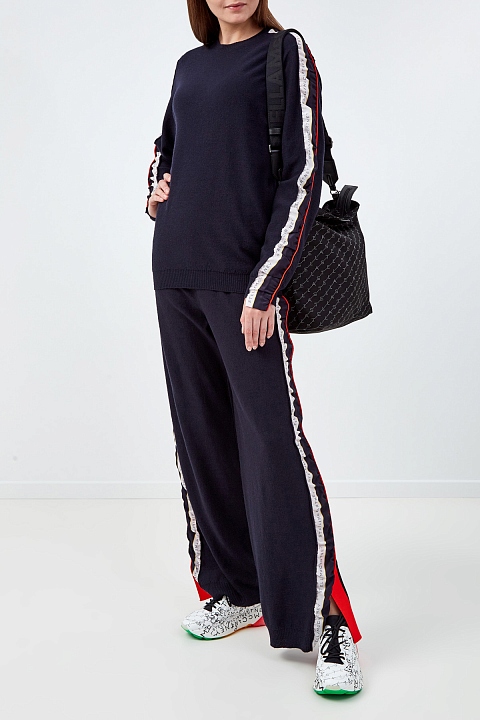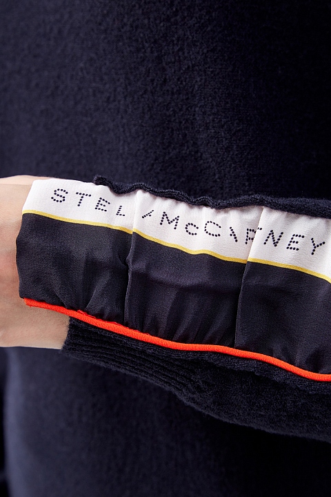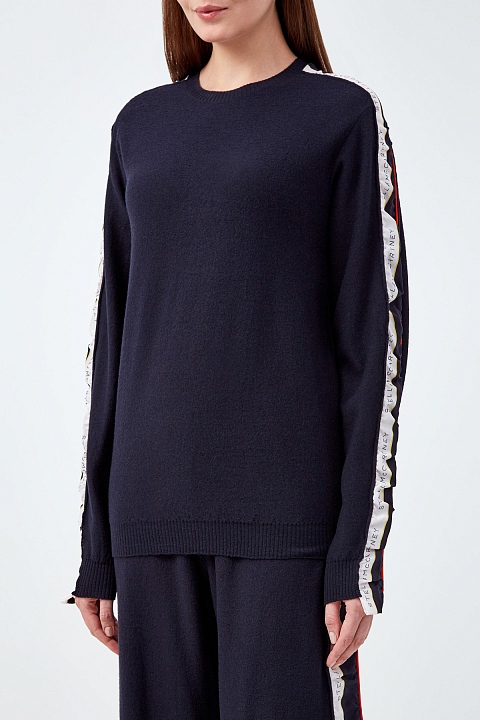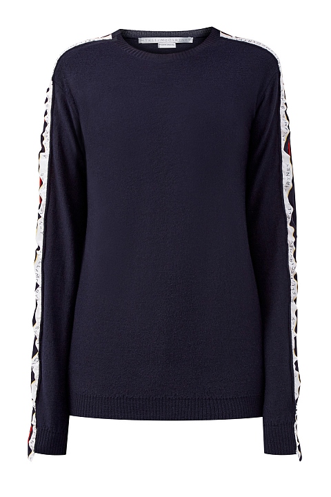 Лаконичный джемпер от Stella McCartney выполнен из шерстяной пряжи в чернильно-синем оттенке. Трикотаж повторяет каждое движение благодаря тонкой и гладкой вязке. Расслабленный силуэт дополнен лампасами из шелковой ткани — детали в спортивном стиле приобретают новое звучание за счет струящихся натуральных фактур. Эластичная отделка нижнего края и манжет в рубчик делает посадку максимально комфортной.