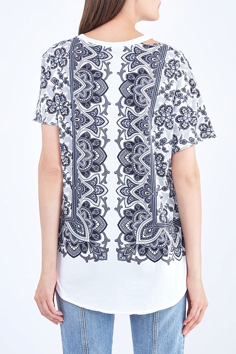 Стильная женская футболка Alexander McQueen свободного кроя. Модель выполнена из легкого дышащего хлопка белого цвета. Изделие украшено изящным контрастным принтом с ажурным узорами. Футболка с короткими втачными рукавами, скругленной кромкой и круглым вырезом горловины, дополненным разрезом. Сделано в Италии.