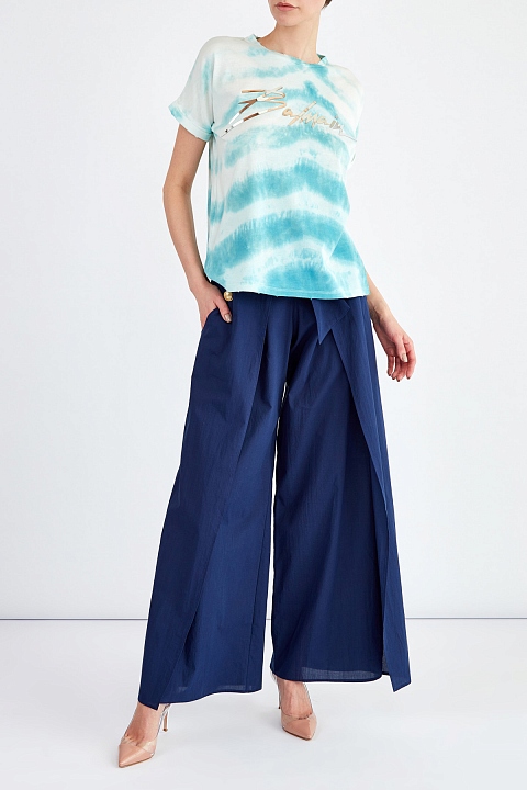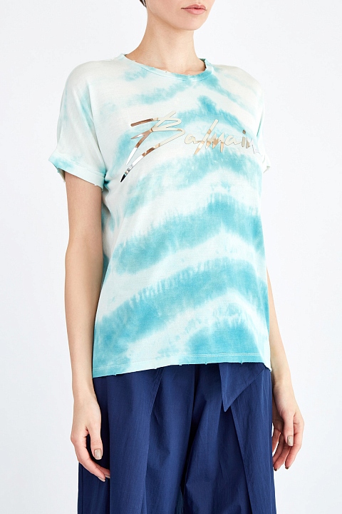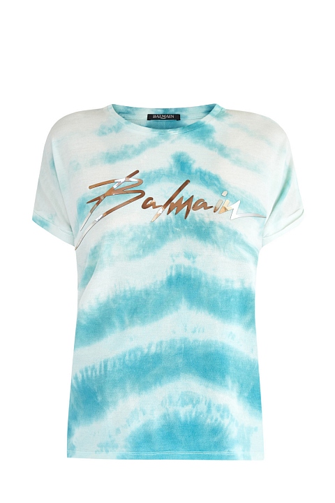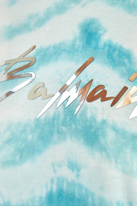 Базовая футболка от Balmain выполнена в голубой гамме из тонкого хлопкового джерси с принтом в технике тай-дай. Гладкая фактура материала дополнена декоративными потертостями и отверстиями, которые придают модели выраженный винтажный эффект. Передняя планка декорирована монограммой бренда с зеркальным напылением. Детали: круглая пройма горловины, кромки закрыты объемным швом двойной иглой, цельнокроеные рукава с отворотами.