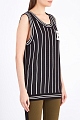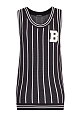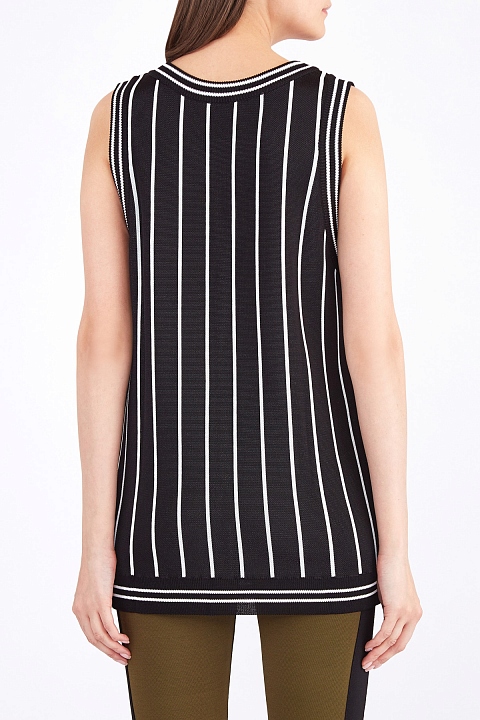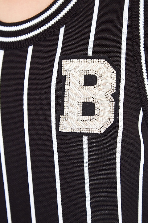 Стильный женский топ из коллекции Balmain удлиненного приталенного кроя. Модель создана из легкого эластичного материала черного цвета в стилистике, напоминающей спортивную форму баскетбольных и бейсбольных команд. Поверхность декорирвоана полосатым принтом, перекликающимся с вывязанным орнаментом на трикотажных кромках открытых пройм и ворота. Образ завершает объемная аппликация в виде буквы B на груди — первой буквы названия бренда.
