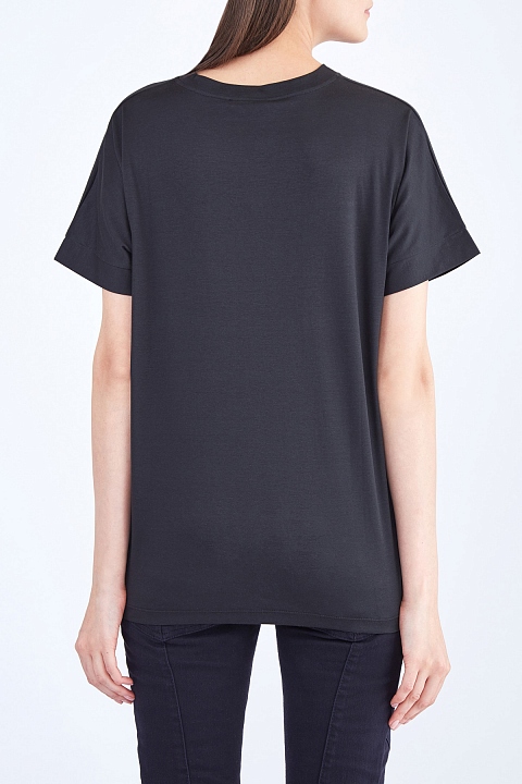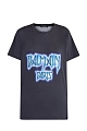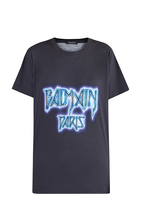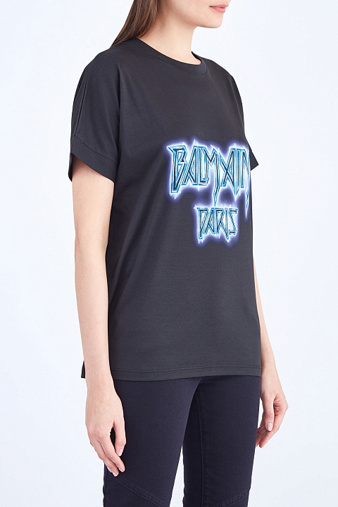 Яркая женская футболка из коллекции осень-зима от Balmain выполнена из хлопкового джерси в черном цвете. Передняя планка декорирована контрастной аппликацией с монограммой бренда в рокерском стиле. Модель кроя oversize дополнена круглой проймой горловины и цельнокроеными рукавами.