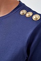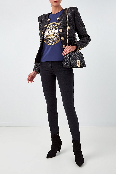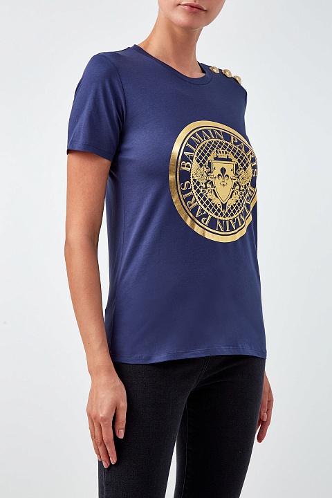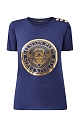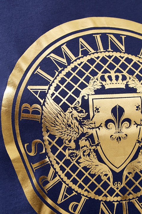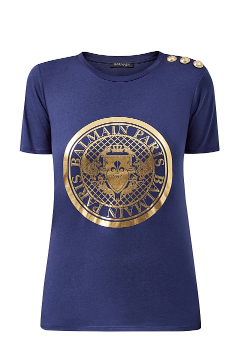 Базовая футболка прямого силуэта от Balmain выполнена из хлопкового джерси кобальтово-синего цвета. Передняя планка декорирована аппликацией с макро-логотипом бренда, созданным в металлизированном золотистом оттенке. Детали: модель без рукавов, декор в виде фирменных тисненых заклепок на плечевом шве.