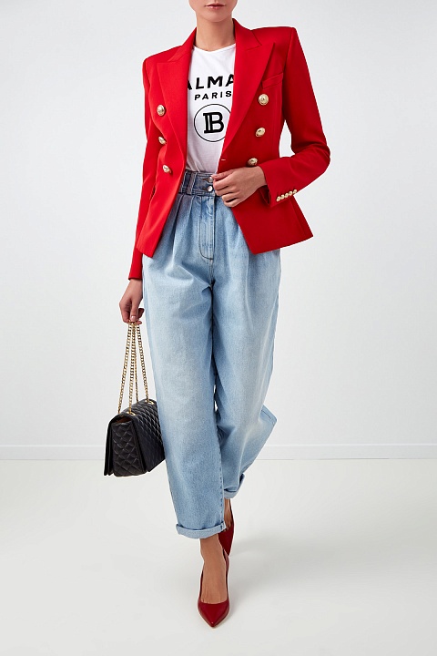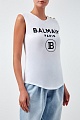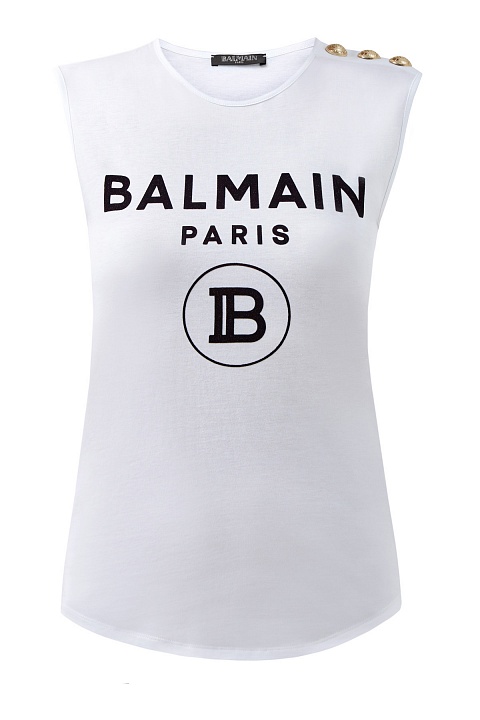Базовая футболка свободного силуэта от Balmain выполнена из хлопкового джерси в белом цвете. Передняя планка декорирована объемной бархатной аппликацией с логотипом Модного дома. Закругленные нижние кромки позволяют носить модель как в заправленном виде, так и навыпуск. Детали: модель без рукавов, застежка на фирменные кнопки на плечевом шве.