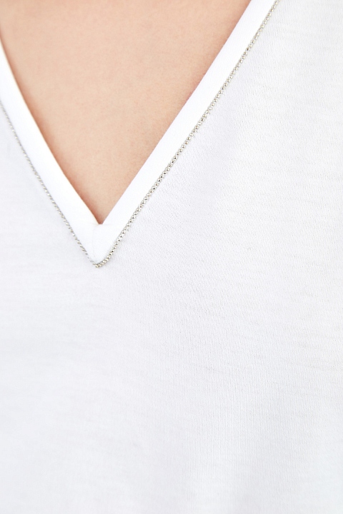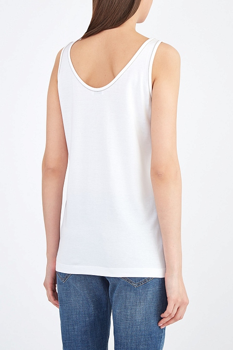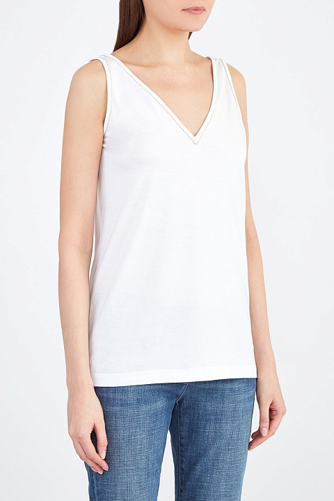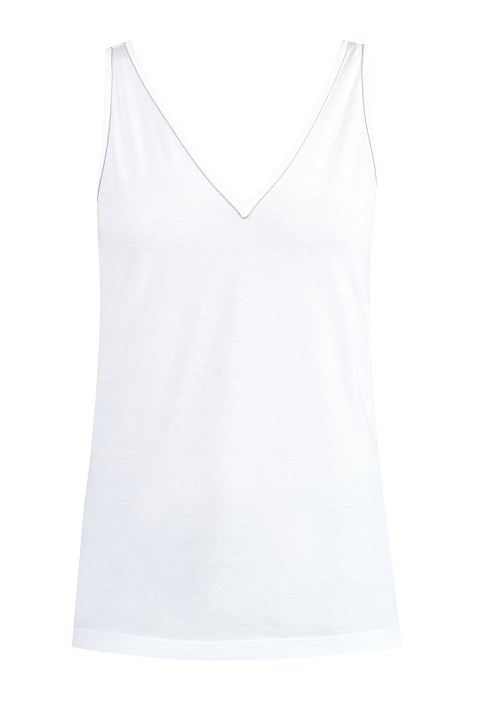 Минималистичный топ кроя по фигуре от Brunello Cucinelli создан из матового хлопкового джерси в базовом белом цвете. Кромка V-образной горловины, проймы и декольтированной спинки полностью окантованы сверкающей цепочкой мониль в фирменном стиле. Детали: широкие бретели, слегка удлиненный крой для комфортной посадки. Сделано в Италии.