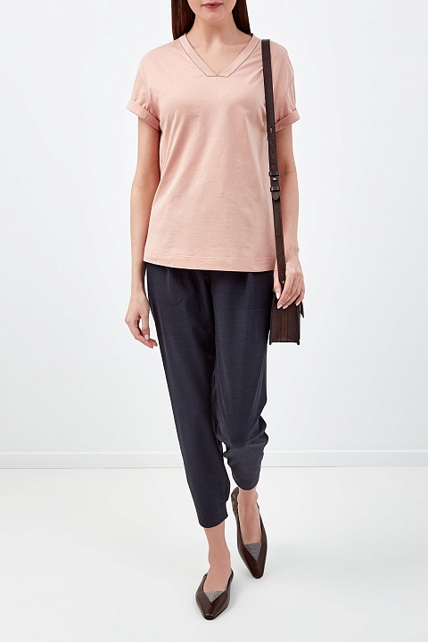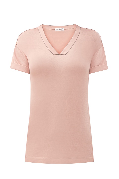 Футболка свободного кроя от Brunello Cucinelli выполнена в пастельном пудрово-розовом оттенке из гладкого хлопка джерси. Однородные волокна собранного вручную хлопка образуют гладкую фактуру с мягким сатиновым блеском по поверхности. V-образный вырез декольте дополнен мерцающей цепочкой Мониль — культовым элементом ДНК бренда. Детали: короткие рукава с отворотами, спущенная линия плеч. Сделано в Италии.