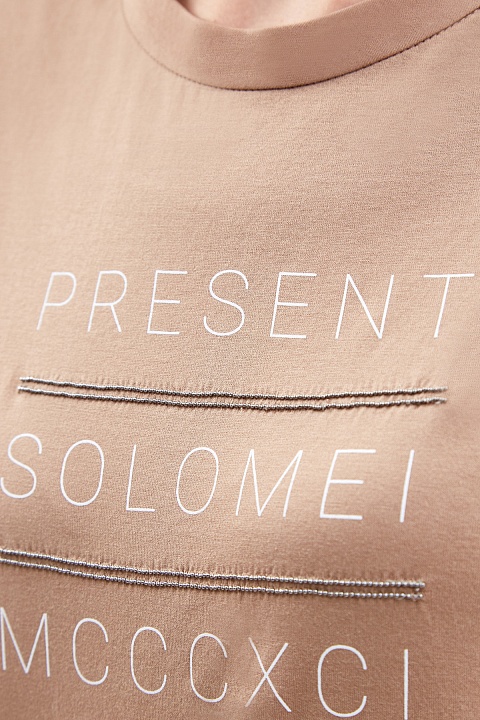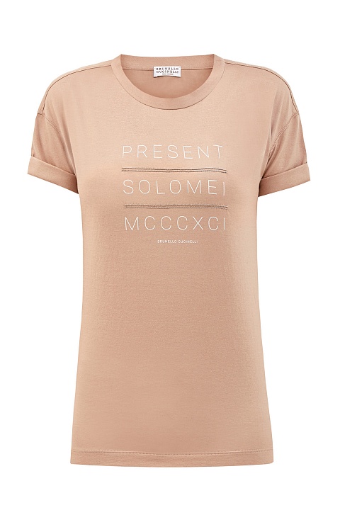 Базовая футболка от Brunello Cucinelli выполнена из мягкого хлопка джерси. Принт-леттеринг, в котором упоминается год основания замка Соломео, посвящен истории Модного дома и дополнен фирменной вышивкой цепочками Мониль. Образ в расслабленном стиле создает свободный крой и рукава с отворотами. застежка на спинке завершает дизайн.Сделано в Италии.