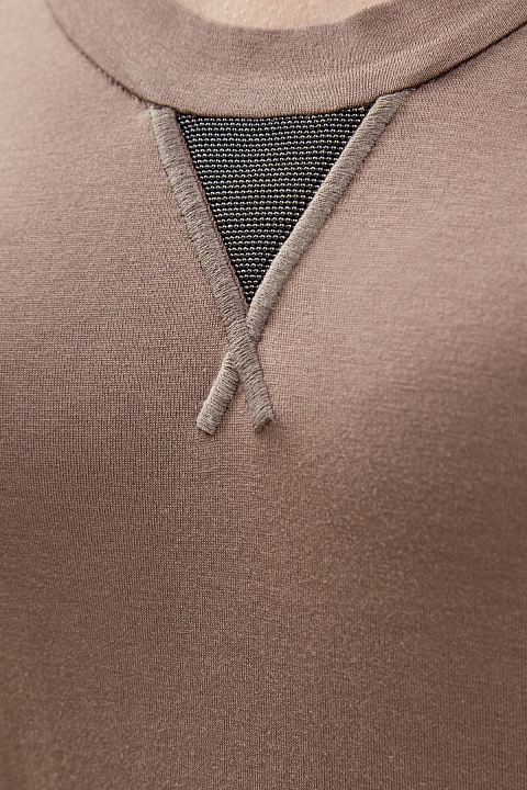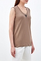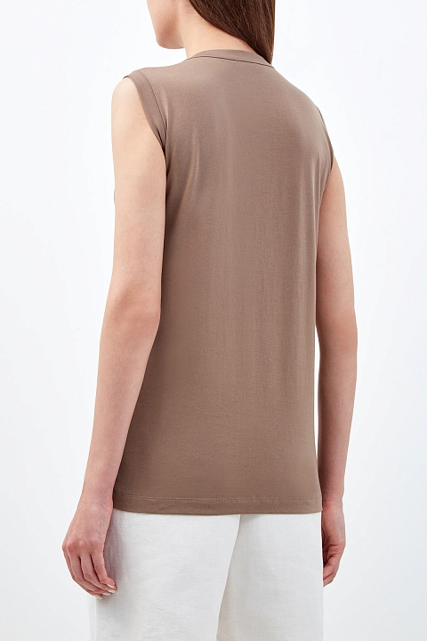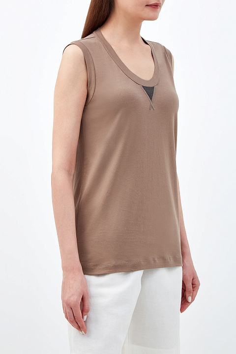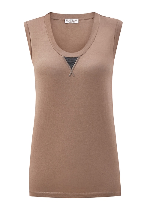 Топ без рукавов от Brunello Cucinelli выполнен из хлопкового джерси Martini в оттенке капучино. Овальный вырез декольте дополнен объемными швами в спортивном стиле и вышивкой Мониль — культовым элементом ДНК бренда. Облегающий фигуру крой является универсальным как для многослойных образов, так и для самостоятельной носки. Сделано в Италии.