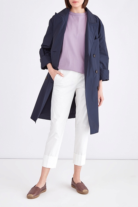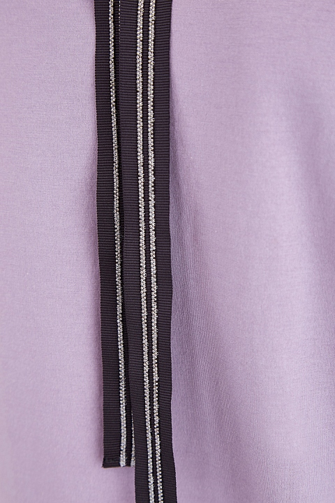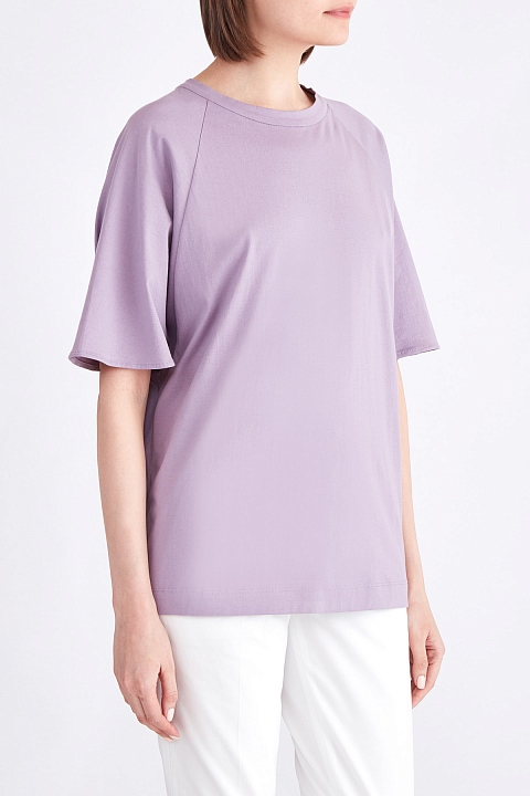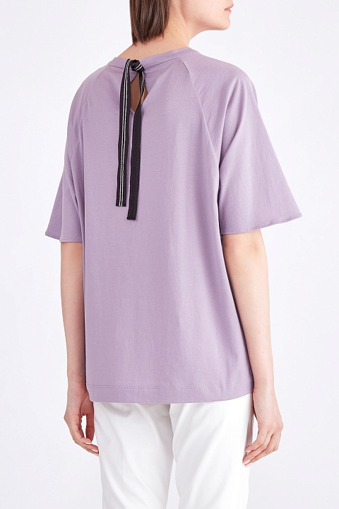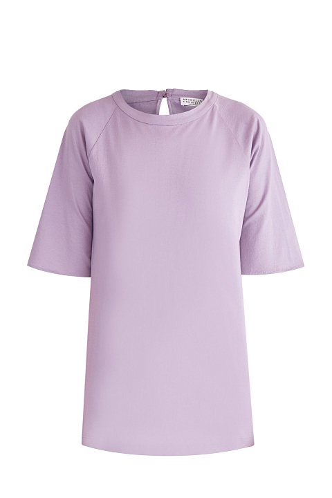 Базовая женская футболка бренда Brunello Cucinelli свободного кроя с удлиненными рукавами-реглан. Модель создана из стрейч хлопка с матовой поверхностью нежно-сиреневого припыленного тона. Изысканный стиль бренда обозначают детали в виде тонкой нити бусин «монили» и застежки-капельки на спинке с контрастными лентами и сияющими бусинами. Сделано в Италии.