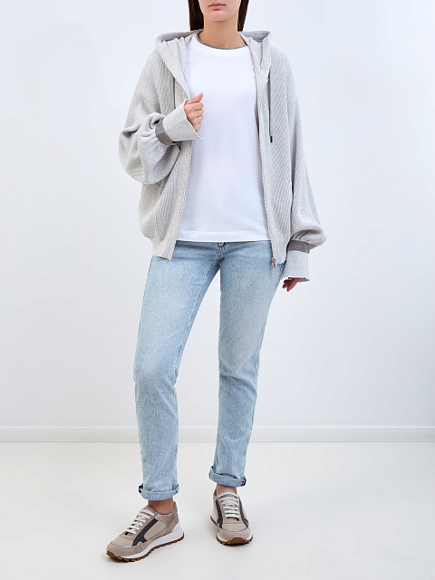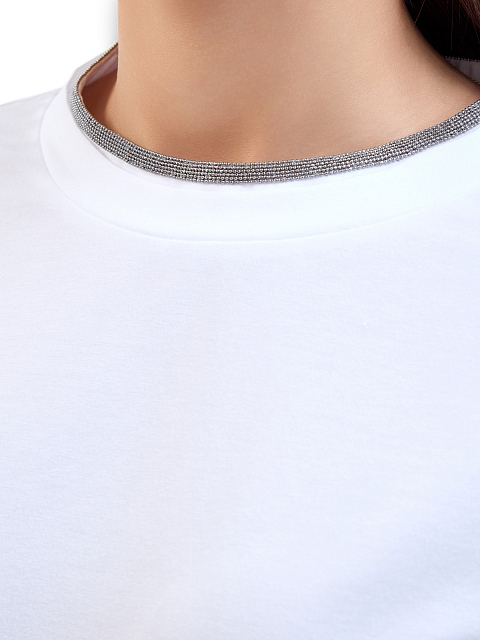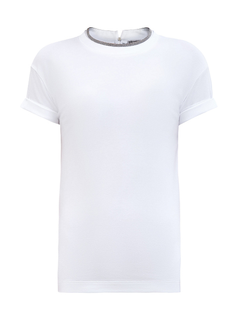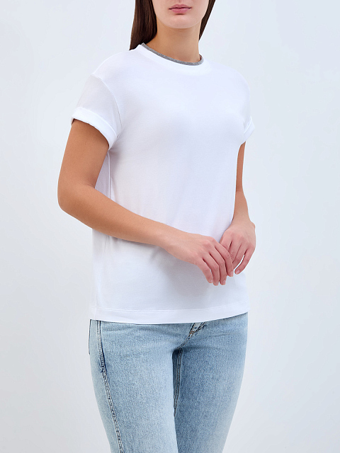 Элегантная женская футболка в белом цвете от Brunello Cucinelli выполнена из хлопка джерси. Гладкая ткань с добавлением эластичных волокон идеально подходит для создания повседневных образов. Фирменный элегантный штрих — окантовка из цепочек мерцающих бусин Мониль ручной огранки. Детали: свободный силуэт, спущенный плечевой шов, застежка на пуговицу на спинке, отвороты на рукавах. Сделано в Италии.