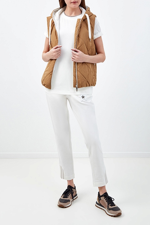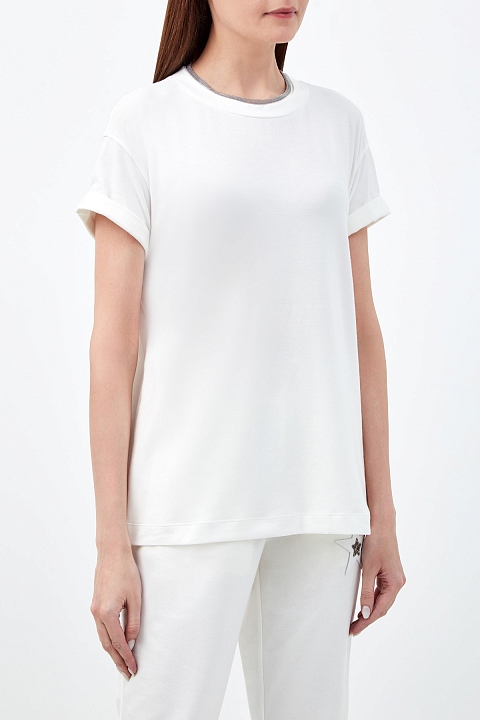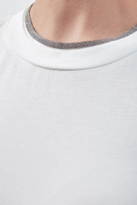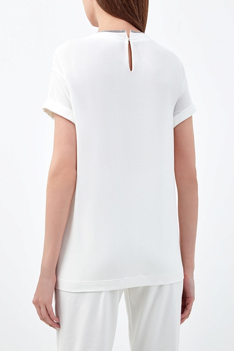 Футболка из гладкого хлопкового джерси от Brunello Cucinelli выполнена в универсальном белом цвете. Круглая пройма горловины с эффектом многослойного образа расшита мерцающей цепочкой Мониль. Детали: застежка на пуговицу на спинке, рукава с отворотами. Сделано в Италии.