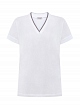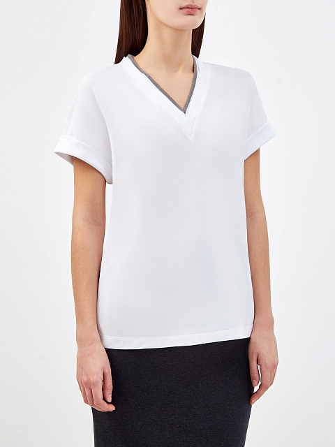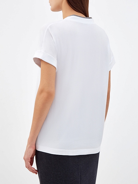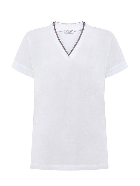 Элегантная женская футболка от Brunello Cucinelli выполнена из гладкого джерси в белом цвете. Волокна собранного вручную хлопка с эластаном придают ткани мягкую и струящуюся фактуру. Вышивка рядами ювелирной цепочки Мониль вдоль V-образного выреза подчеркивает расслабленный стиль изделия. Сделано в Италии.