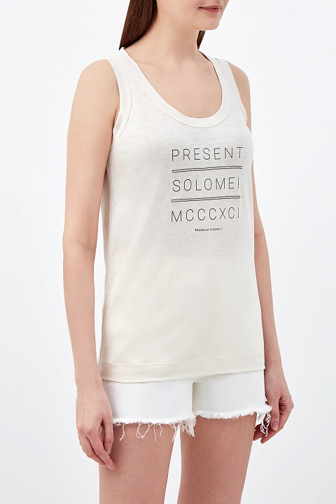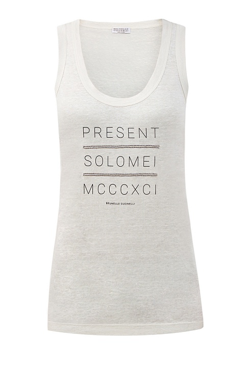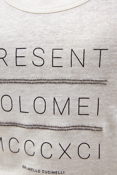 Базовый топ от Brunello Cucinelli выполнен из льняного джерси. Характерная неоднородная текстура натурального материала придает образу легкую небрежность. Принт-леттеринг, в котором упоминается год основания замка Соломео, посвящен истории Модного дома и дополнен фирменной вышивкой цепочками Мониль. Детали: объемная окантовка кромок, свободный крой. Сделано в Италии.