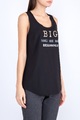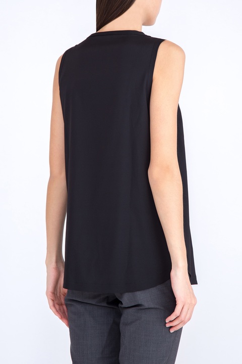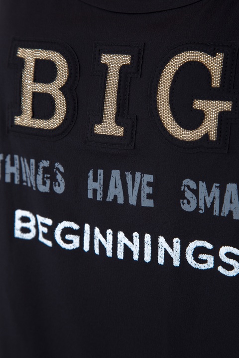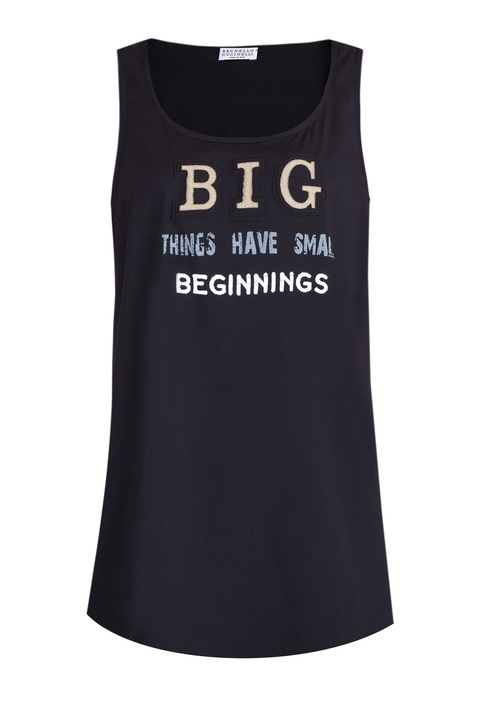 Женский топ без рукавов из весенне-летней коллекции Brunello Cucinelli выполнен из нежнейшего шелка черного тона. Изделие декорировано нашивками с фактурой поверхностью и аппликациями. Надпись гласит: «Великие дела начинаются с малого». Свободный крой и широкие бретели завершают образ. Сделано в Италии.