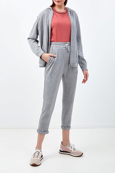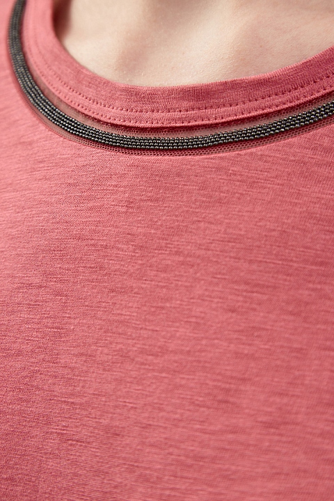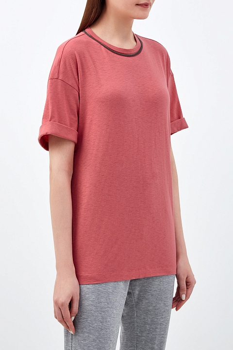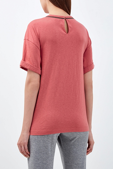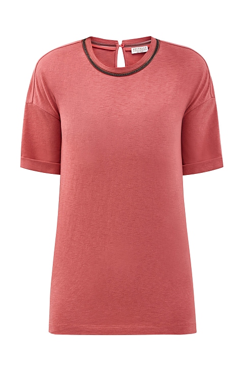 Футболка из гладкого хлопкового джерси от Brunello Cucinelli выполнена в универсальном кораллово-розовом цвете. Расслабленный крой со спущенной линией плеч и однотонное исполнение делают модель незаменимым элементом базового гардероба. Круглая пройма горловины расшита мерцающей цепочкой Мониль. Детали: застежка на пуговицу на спинке, короткие рукава. Сделано в Италии.