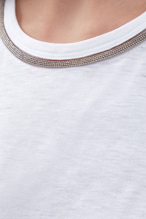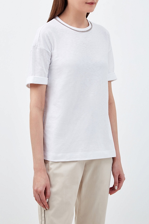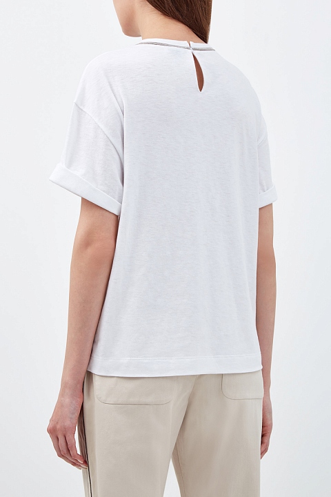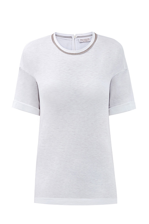 Футболка из гладкого хлопкового джерси от Brunello Cucinelli выполнена в универсальном белом цвете. Расслабленный крой со спущенной линией плеч и однотонное исполнение делают модель незаменимым элементом базового гардероба. Круглая пройма горловины расшита мерцающей цепочкой Мониль. Детали: застежка на пуговицу на спинке, короткие рукава. Сделано в Италии.