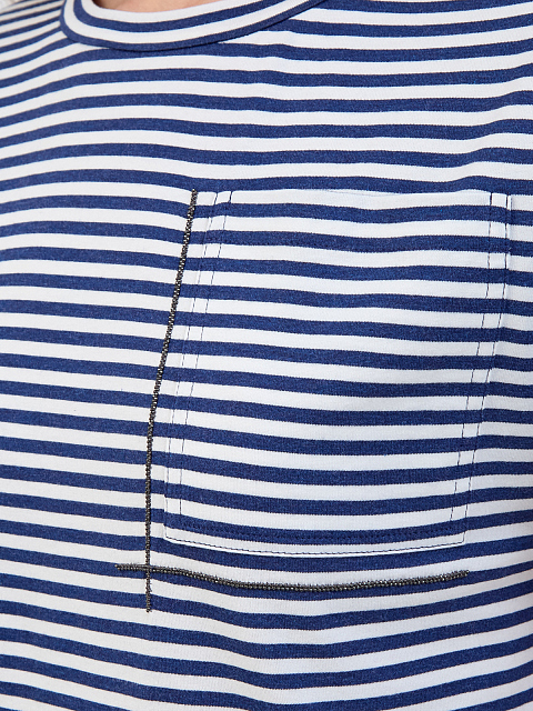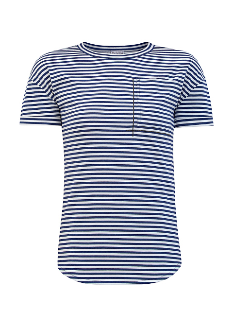 Универсальная футболка из легкого хлопкового джерси от Brunello Cucinelli отличается узором в бело-голубую полоску и неформальным настроением. Деталь из блестящей цепочки Мониль обрамляет кармашек, добавляя женственную ноту в фирменном стиле Brunello Cucinelli. Детали: короткие рукава с отворотами. закругленный нижний край. Сделано в Италии.