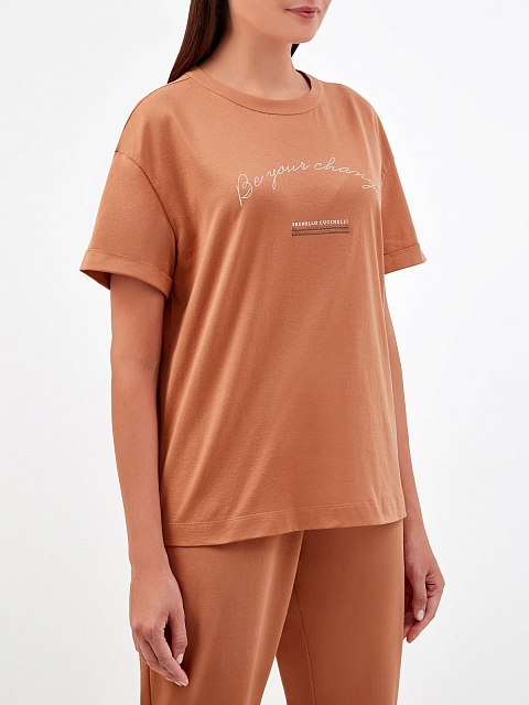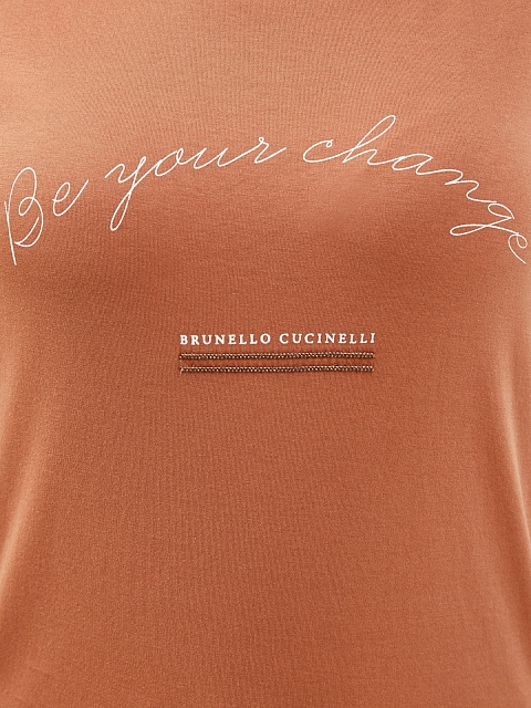 Женская футболка от Brunello Cucinelli выполнена из гладкого джерси — дышащая ткань на основе собранного вручную хлопка идеально подходит для создания повседневных образов. Фирменный элегантный штрих — цепочка мерцающих бусин Мониль ручной огранки и сезонный принт Be Your Change. Детали: удлиненный свободный силуэт, спущенный плечевой шов, круглый вырез горловины. Сделано в Италии.