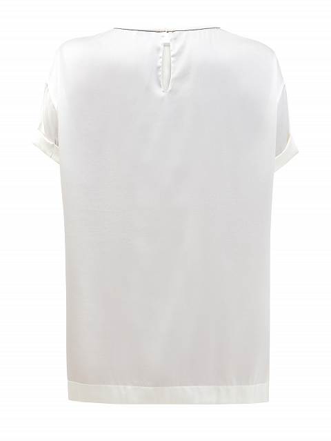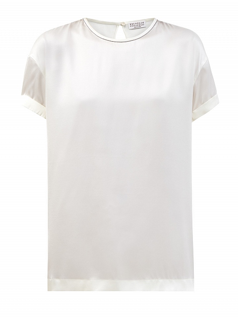 Элегантная футболка от Brunello Cucinelli выполнена из гладкого шелкового атласа в жемчужном цвете. Слегка облегающий фигуру крой и однотонное исполнение делают модель незаменимым элементом женского гардероба. Круглая пройма горловины расшита мерцающей цепочкой Мониль, элементом ДНК бренда. Детали: застежка на пуговицу на спинке, короткие рукава. Сделано в Италии.