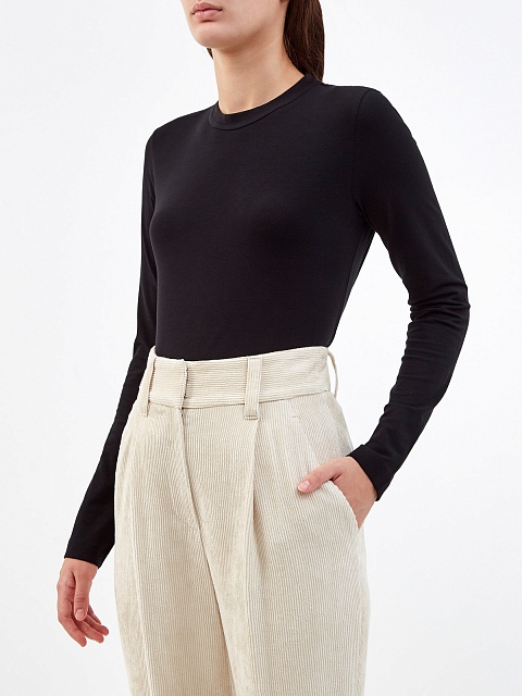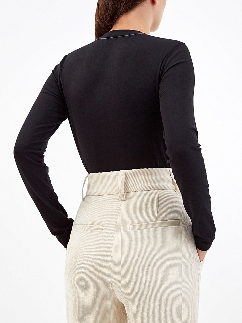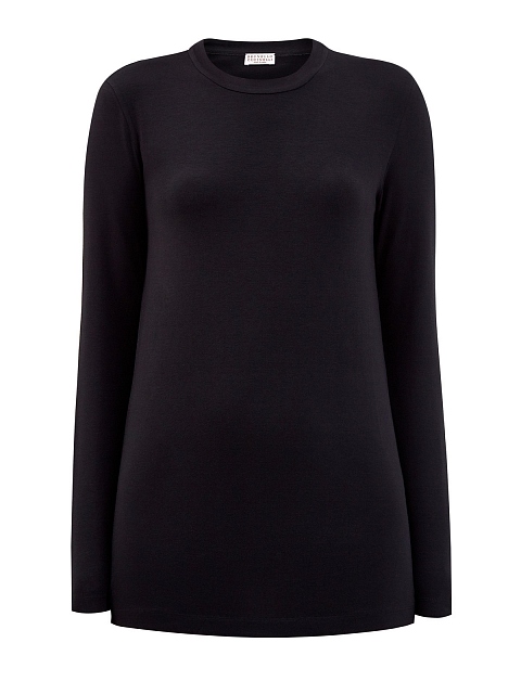 Лаконичный лонгслив от Brunello Cucinelli выполнен из эластичного хлопка. Базовый черный цвет и облегающий фигуру крой делает модель универсальной базой для составления многослойных образов. Классический круглый вырез декольте дополнен цепочкой бусин Мониль на спинке. Сделано в Италии.