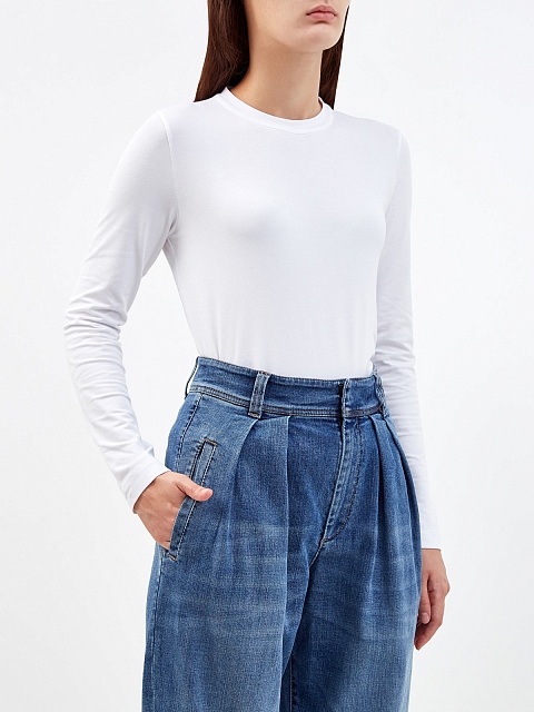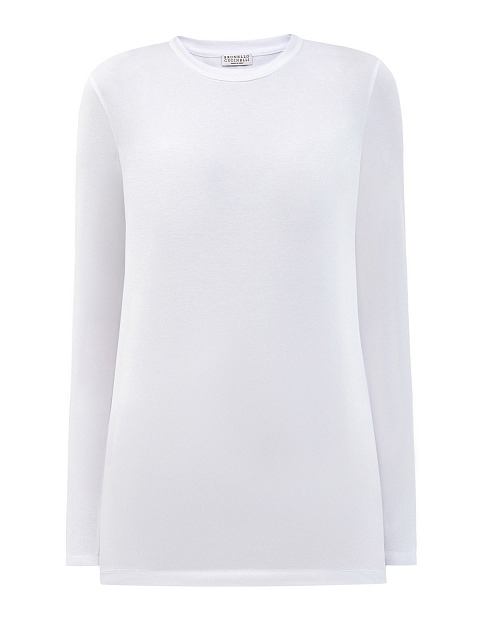 Базовый лонгслив от Brunello Cucinelli выполнен из эластичного хлопка. Белоснежный оттенок и облегающий фигуру крой делает модель универсальной базой для составления многослойных образов. Классический круглый вырез декольте дополнен цепочкой бусин Мониль на спинке. Сделано в Италии.