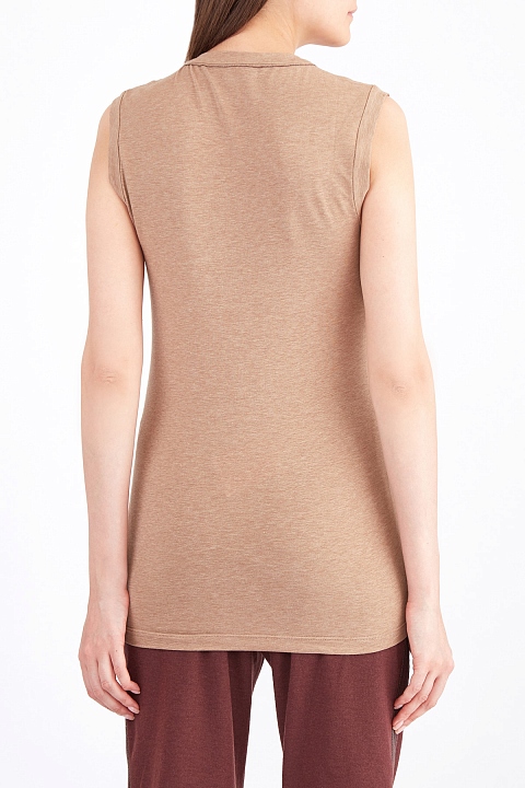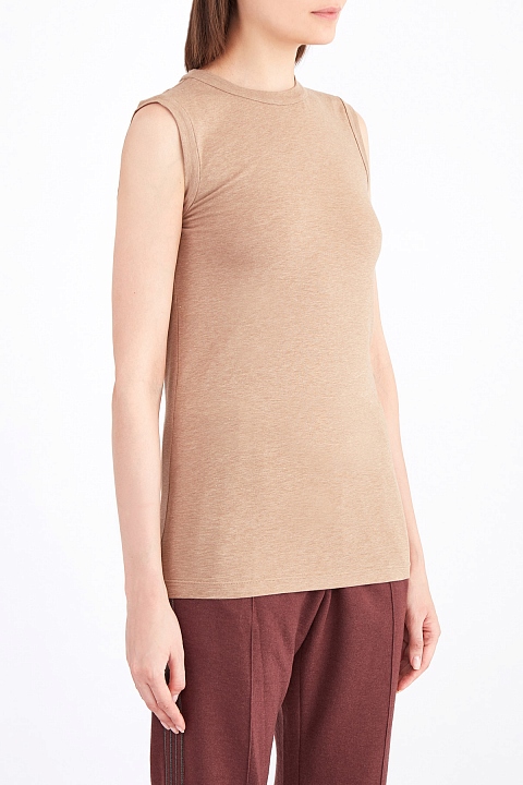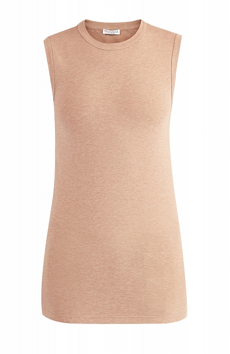 Базовый женский топ из коллекции Brunello Cucinelli облегающего кроя с открытыми проймами. Модель создана из стрейч хлопка с матовой поверхностью песочного цвета, поддерживающего концепцию бренда с чистыми природными оттенками. У круглого ворота на спинке расположена тонкая нить бусин «монили» — изысканный символ бренда. Сделано в Италии.