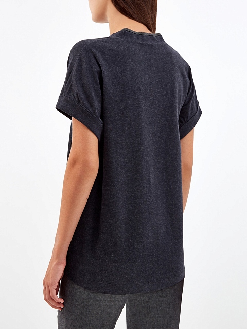 Лаконичная женская футболка от Brunello Cucinelli выполнена из ценного хлопкового джерси в пепельно-сером оттенке. Волокна собранного вручную хлопка с эластаном придают ткани мягкую и струящуюся фактуру. Вышивка рядами ювелирной цепочки Мониль вдоль V-образного выреза подчеркивает расслабленный стиль изделия. Сделано в Италии.
