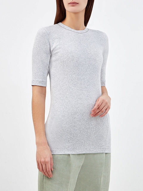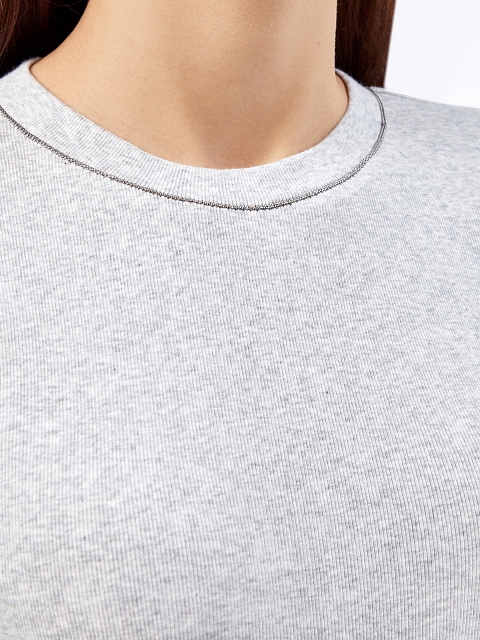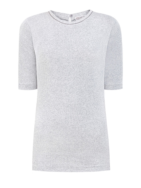 Серая женская футболка от Brunello Cucinelli выполнена из эластичного хлопка — мягкой и гигроскопичной ткани, которая идеально подходит для повседневных образов. Фирменный элегантный штрих — цепочка мерцающих бусин Мониль ручной огранки вдоль ворота. Детали: короткие рукава, удлиненный облегающий силуэт, застежка на пуговицу на спинке. Сделано в Италии.