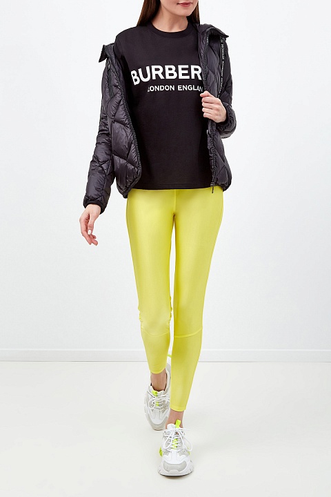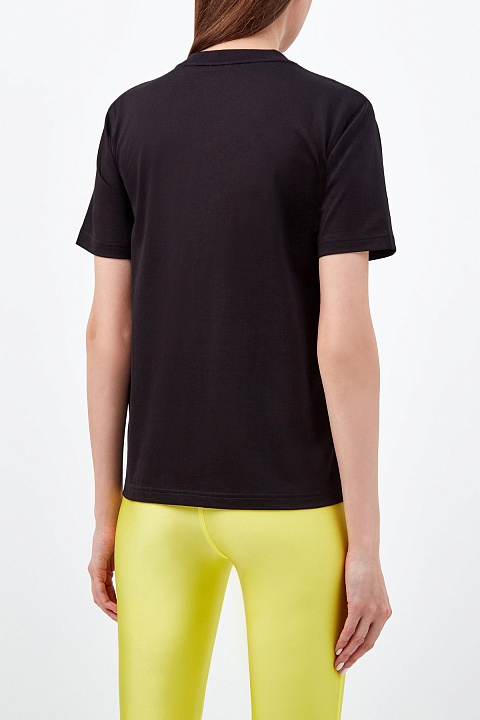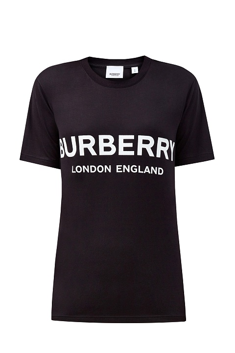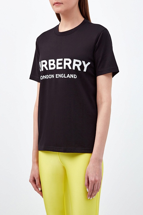 Минималистичная женская футболка от Burberry выполнена из мягкого хлопка джерси в базовом черном цвете. Дышащая и эластичная ткань делает любой повседневный образ максимально комфортным. Фирменный штрих — контрастная монограмма бренда в технике аппликации. Детали: свободный не стесняющий движений крой, короткие рукава, круглый вырез горловины.