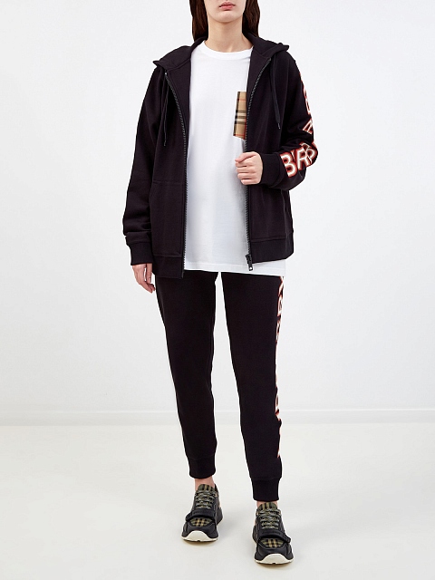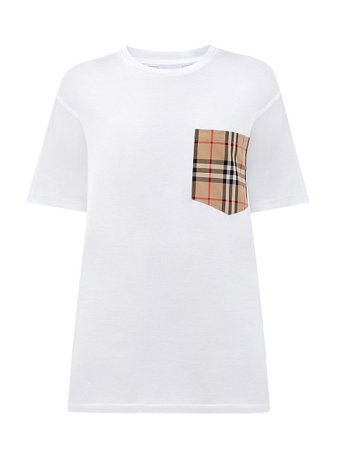 Базовая футболка расслабленного силуэта от Burberry выполнена из мягкого хлопкового джерси белоснежного тона. Модель дополнена накладным карманом из контрастной по фактуре хлопковой ткани в фирменную клетку Vintage Check. Детали: свободный крой, круглая пройма горловины, спущенный плечевой шов.