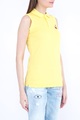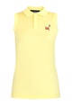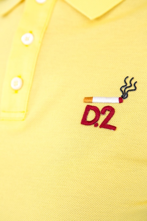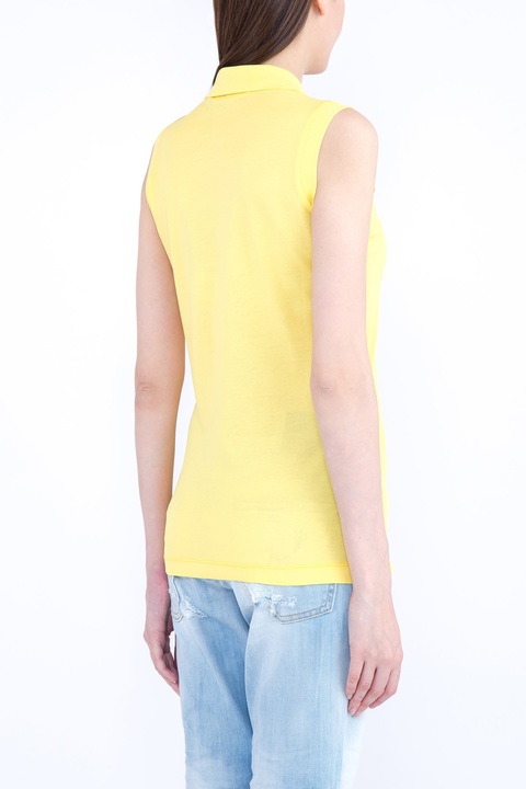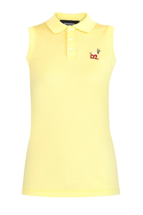 Стильная женская футболка-поло Dsquared2 приталенного кроя, выполненная из плотного хлопкового джерси канареечного цвета. Модель с открытыми проймами и отложным воротником с центральной планкой на пуговицах. Изделие дополнено вышитым логотипом бренда на груди.