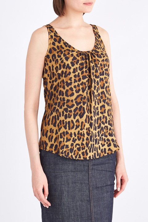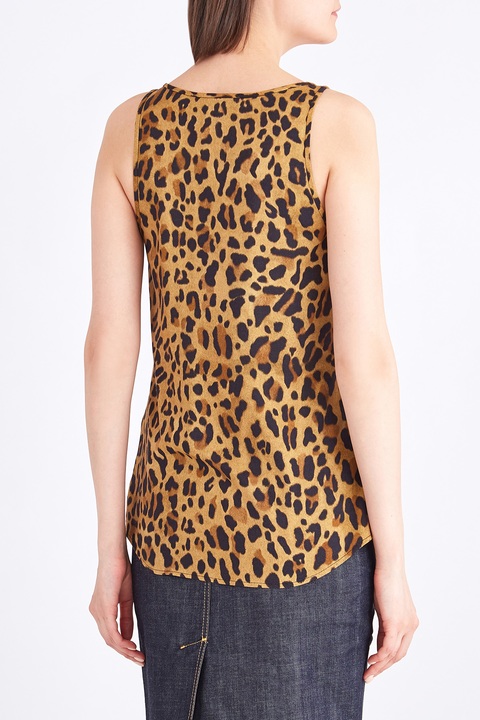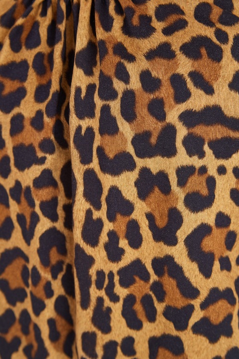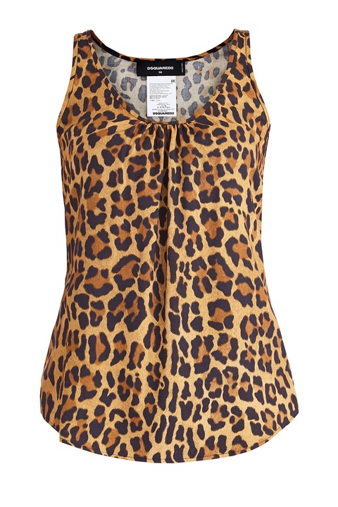 Эффектный женский топ из весенне-летней коллекции Dsquared2 выполнен из струящейся вискозы в коричневых тонах с декором набивным принтом с леопардовым мотивом. Изящный углубленный вырез декольте дополнен сборками, которые создают мягкие драпировки. Асимметричные нижние кромки, удлиненные по центру планок, завершают яркий образ.