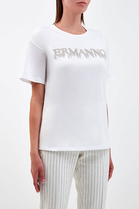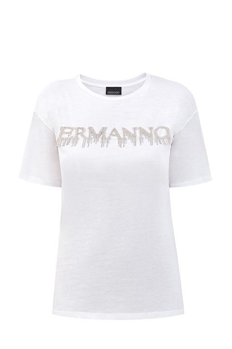 Легкая женская футболка от Ermanno Ermanno Scervino выполнена из хлопкового джерси в лаконичном белом цвете. Натуральный дышащий материал идеально подходит для летнего сезона. Модель со свободным силуэтом и разрезами по бокам обеспечивает комфорт в движении. Фактурная аппликация из серебристых стразов с монограммой бренда придает образу изысканный акцент. Детали: круглый вырез горловины, асимметричный нижний край, короткие рукава.
