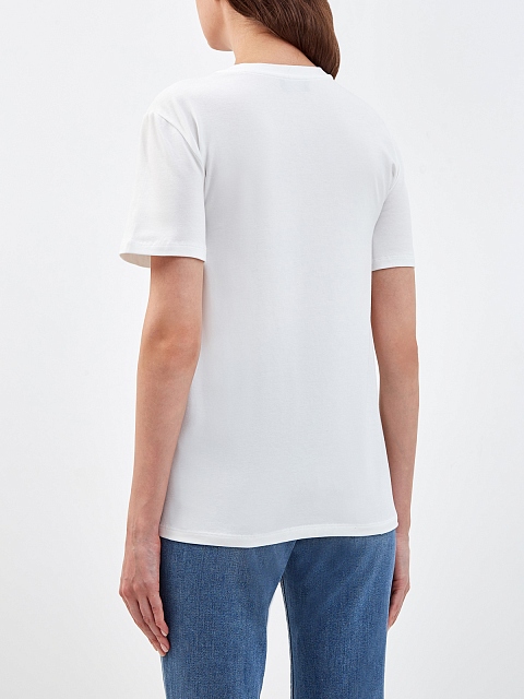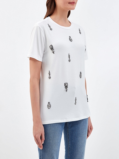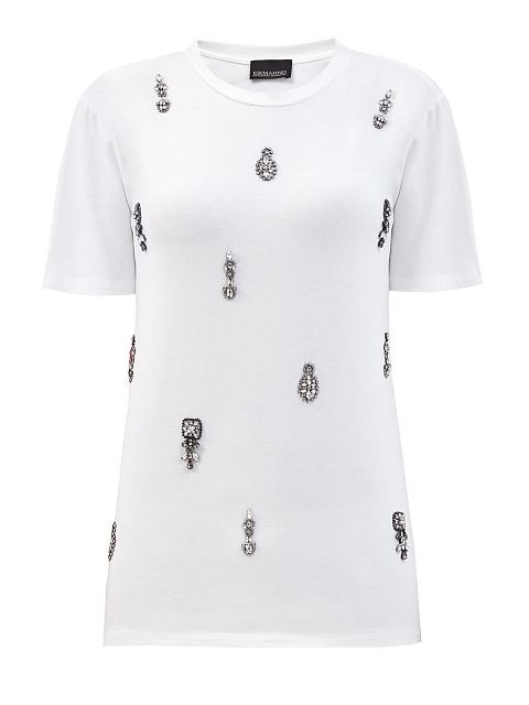 Однотонная женская футболка от Ermanno Ermanno Scervino выполнена из эластичного хлопкового джерси. Базовый белый цвет делает модель универсальным элементом гардероба, отделка из мерцающих серебристых кристаллов на передней планке подчеркивает присущую бренду элегантность. Детали: свободный крой, круглый вырез горловины, короткие рукава.