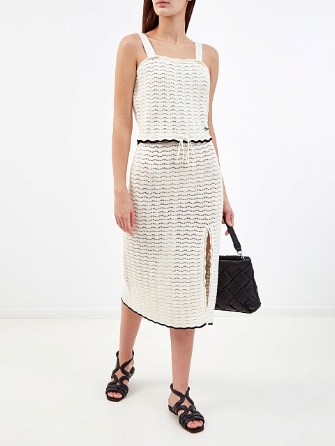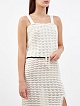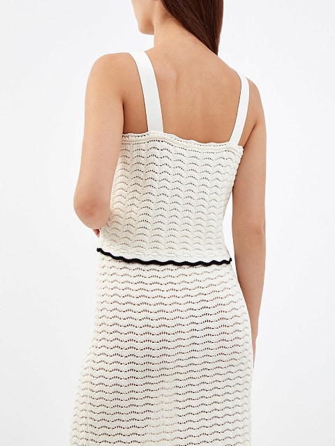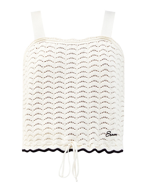 Элегантный топ от Ermanno Firenze выполнен из мягкой хлопковой пряжи в кремовом оттенке, техника узорной вязки подчеркивает женственный стиль изделия. Регулируемая кулиска по нижнему краю обеспечивает посадку точно по фигуре. Детали: контрастная окантовка, широкие бретели, вышитый логотип бренда.