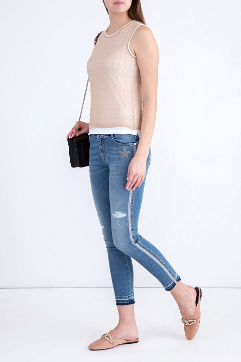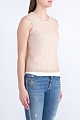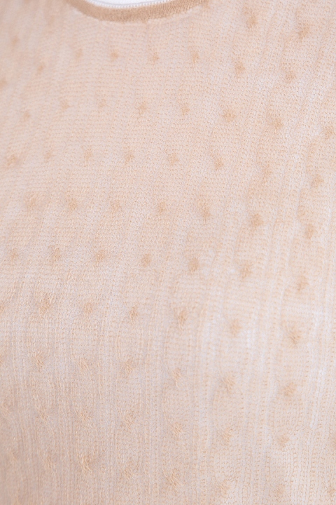 Изящный женский топ Ermanno Scervino с открытыми проймами и круглым воротом. Модель состоит из двух частей, базового внутреннего топа белого цвета и внешней части, вывязанной фигурным узором из нитей шерсти и мохера бежевого тона. Сделано в Италии.