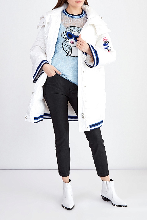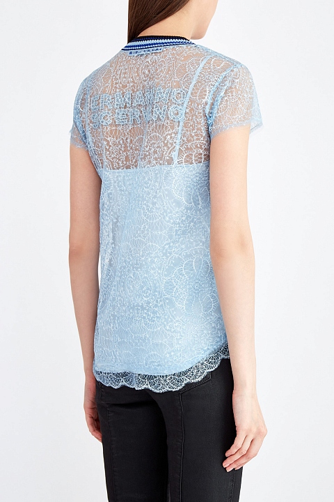 Воздушная кружевная футболка от Ermanno Scervino выполнена из шелкового ажурного полотна ручной работы. Модель в пастельном голубом оттенке декорирована знаковым для коллекции графическим принтом в стиле поп-арт. Фирменный стиль спортшик подчеркнут круглой проймой горловины с вязаной окантовкой. Детали: внутренний шелковый топ, асимметричные нижние кромки. Сделано в Италии.
