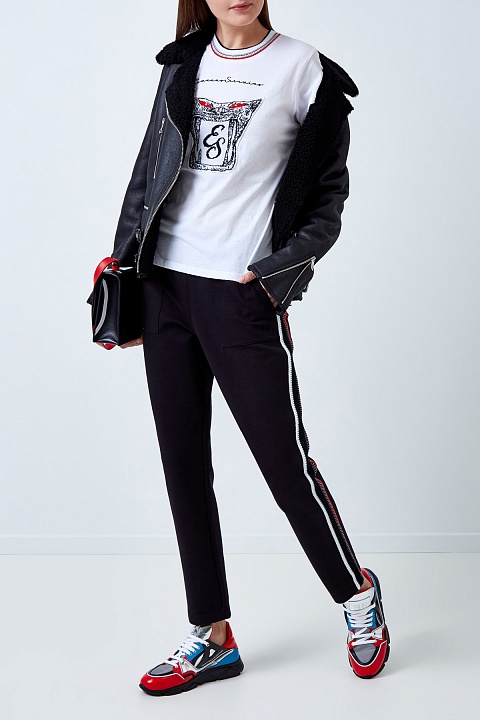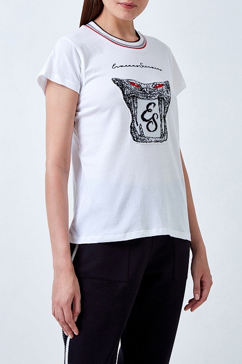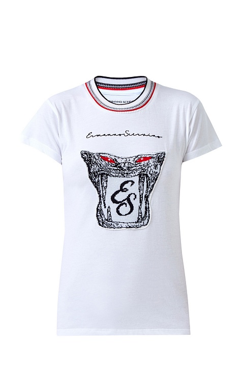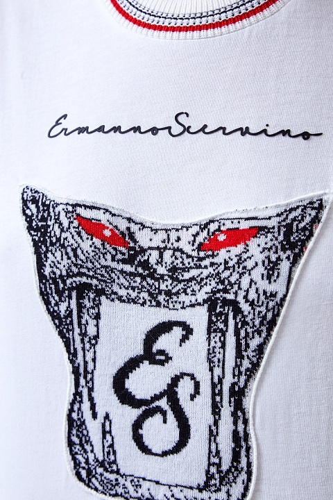 Базовая футболка от Ermanno Scervino выполнена из хлопкового джерси белоснежного цвета. Фирменный стиль подчеркивает трехцветная окантовка круглой проймы горловины — ключевой элемент всей коллекции. Оригинальный штрих вносят вязаное макро-изображение символа бренда, а также объемная монограмма в технике аппликации. Сделано в Италии.