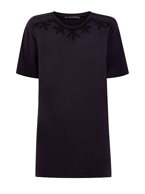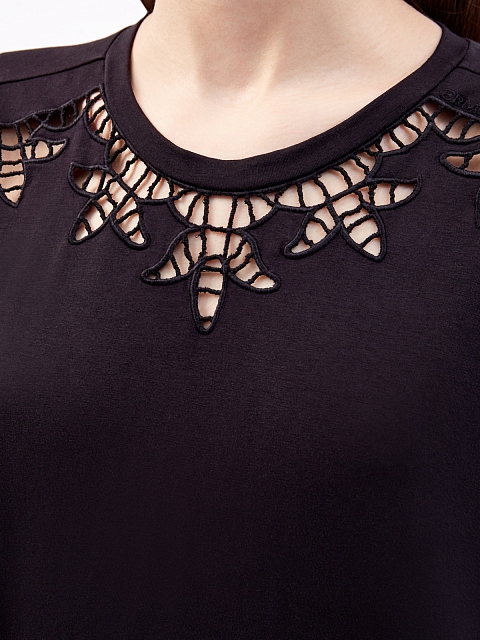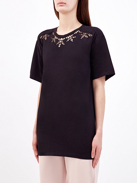 Женская футболка в черном цвете от Ermanno Scervino выполнена из гладкого хлопкового джерси, волокна эластана в составе облегчают уход за изделием. Присущий Модному дому элегантный стиль подчеркнут кружевным перфорированным узором ручной работы. Детали: круглый вырез горловины, короткие рукава. Сделано в Италии.