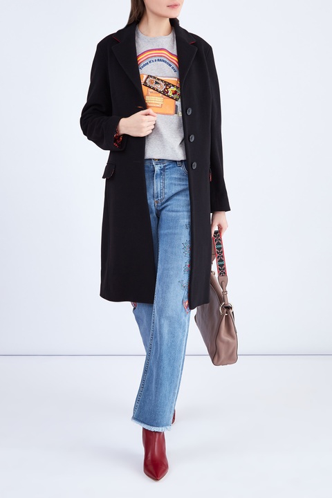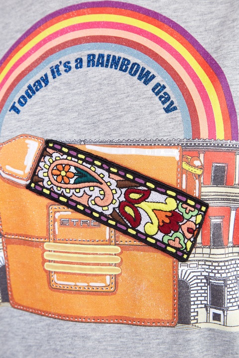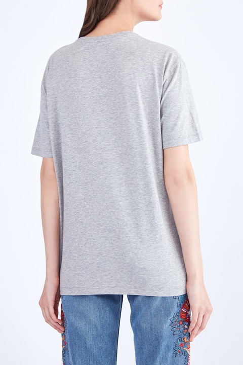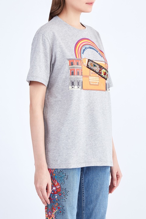Яркая женская футболка кроя oversize из коллекции осень-зима от Etro выполнена из мягкого дышащего хлопкового джерси серого-меланжевого тона. Передняя планка декорирована оригинальным принтом и аппликацией с изображением фирменной символикой и узнаваемой сумкой из коллекций бренда. Изделие со спущенной линией плеча дополнено традиционной отделкой кромок швом двойной иглой и круглой проймой горловины с эластичной тесьмой. Сделано в Италии.