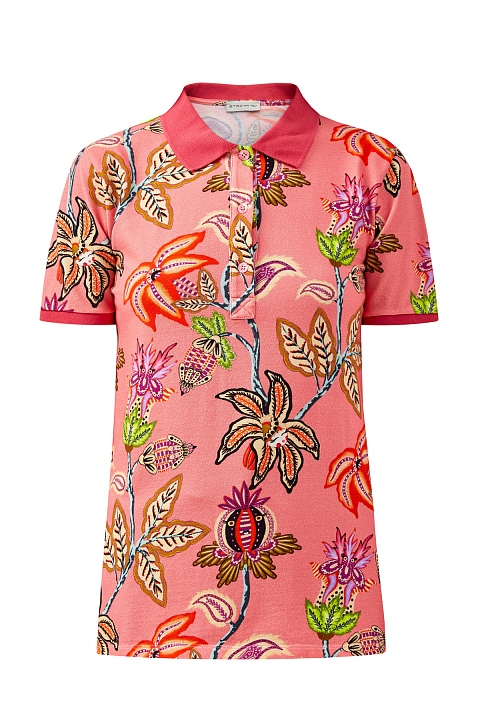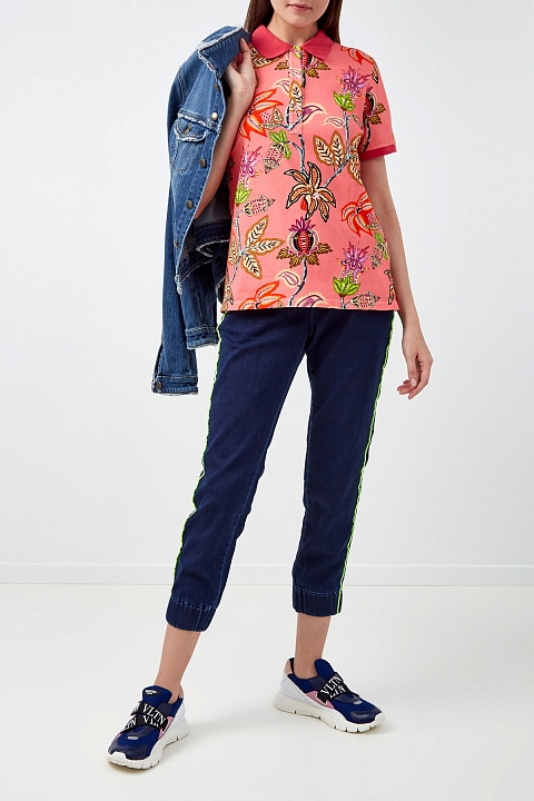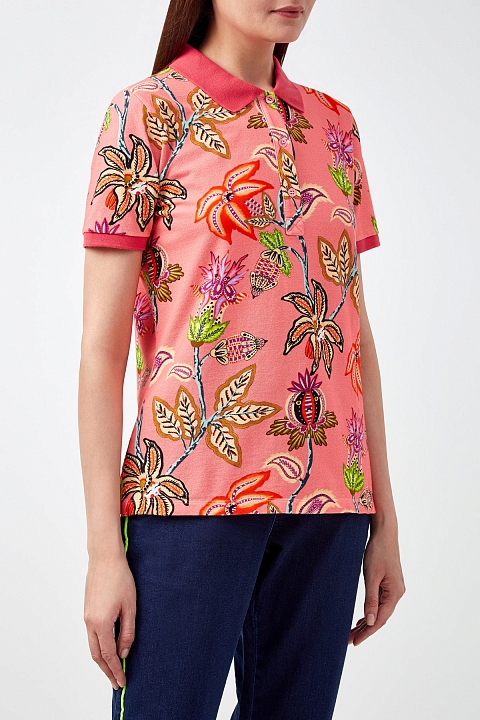 Футболка-поло из пике с цветочным принтом и однотонными кромками