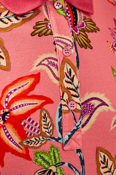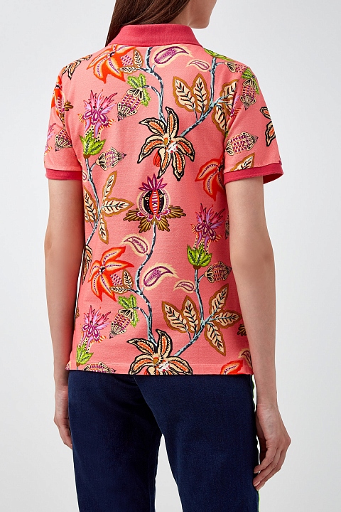 Яркая женская футболка-поло от Etro создана из дышащего хлопкового пике с характерной плетеной фактурой и цветочным набивным макро-принтом по поверхности. Модель в насыщенных коралловых тонах дополнена однотонным отложным воротом и манжетами из трикотажа в рубчик. Застежка на пуговицы из перламутра завершает дизайн. Сделано в Италии.