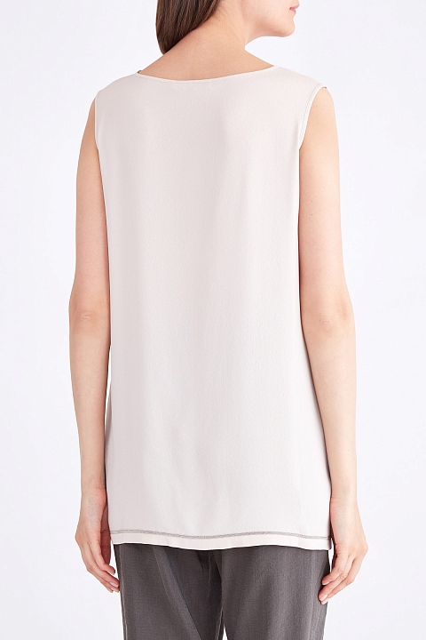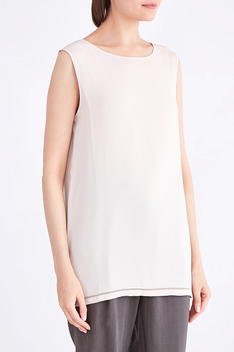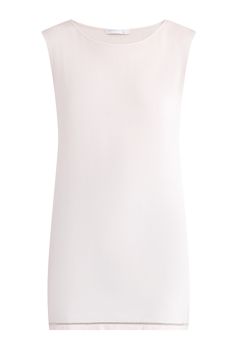Базовый женский удлиненный топ прямого кроя из весенне-летней коллекции Fabiana Filippi выполнен из фактурной струящейся шелковой ткани в светлом персиково-розовом оттенке. Модель без рукавов дополнена овальной проймой горловины и декорирована цепочками фирменных круглых бусин серебристого тона, которые создают элегантный образ. Сделано в Италии.